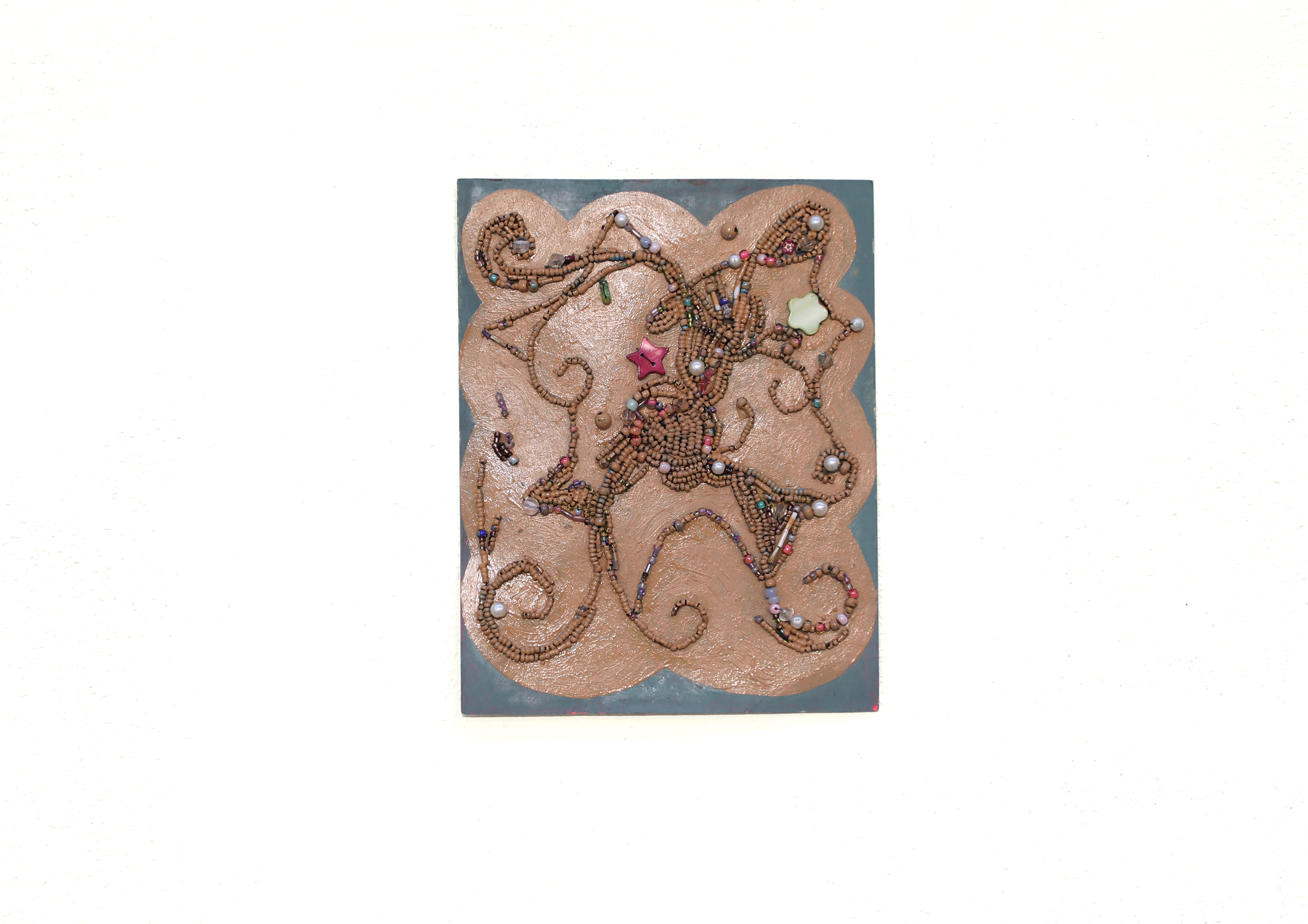 Installation i sex delar, olja på duk, pärlbroderi på duk och papper, garn, nypon, ca 600 x 200 cm.